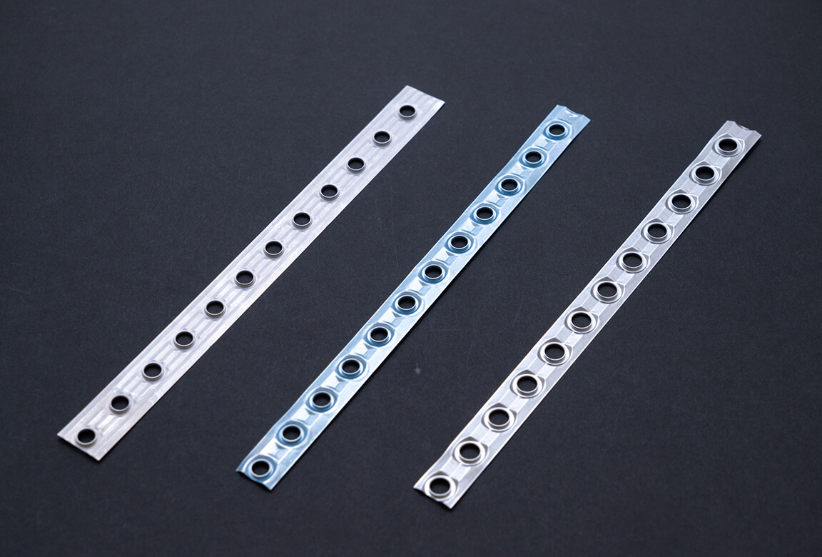 室内機熱交換器用のフィンです。各エアコンメーカー様で研究開発された形状ですので、その形状はさまざまです。フラットな形状のフィンはごくまれで、ほとんどが表面形状に凹凸や切り込み(スリット)などが入っており、空気との接触面を増やす工夫がされています。