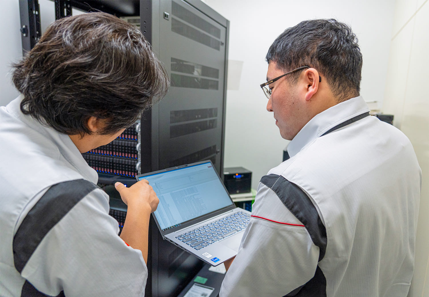 入社後は製造と製品の組み立てを行う部署を経験して、今はもともと希望していたシステムエンジニア(SE)として仕事をしています。社内ネットワークや社内ツールをつくるのが主な仕事ですが、たとえばお客様所有の当社機械の稼働状況が分かるデータを当社まで飛ばしたり、海外のお客様がお持ちの機械のプログラム書き換えを遠隔で行ったりという、いわゆるIoTの仕事も手掛けています。